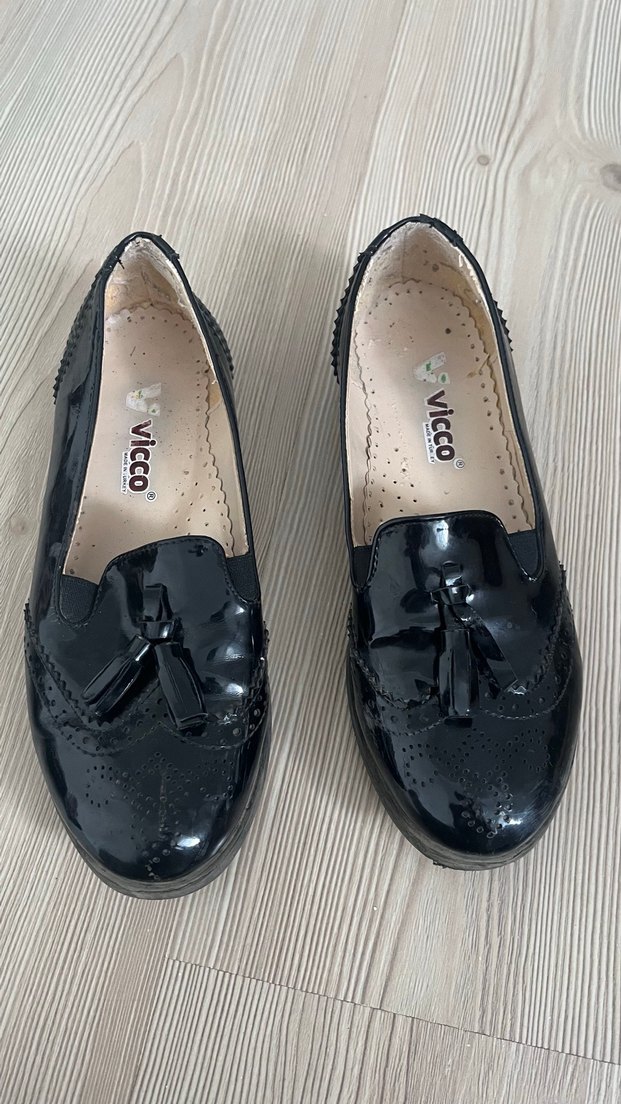 Vicco markalı, parlak siyah özel kız çocuk ayakkabısı, püsküllü ve yılan derisi desenli, dayanıklı kauçuk malzemeden üretilmiştir.