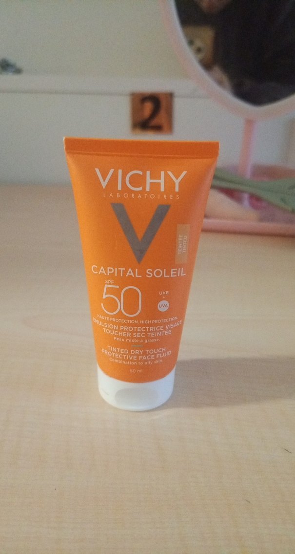Vichy Capital Soleil SPF 50, yüz için renkli ve kuru dokunuşlu yüksek koruma sağlar. UVA ve UVB ışınlarına karşı korur, yağlı ciltlere uygundur. ☀️ bir iki kere kullanıldı