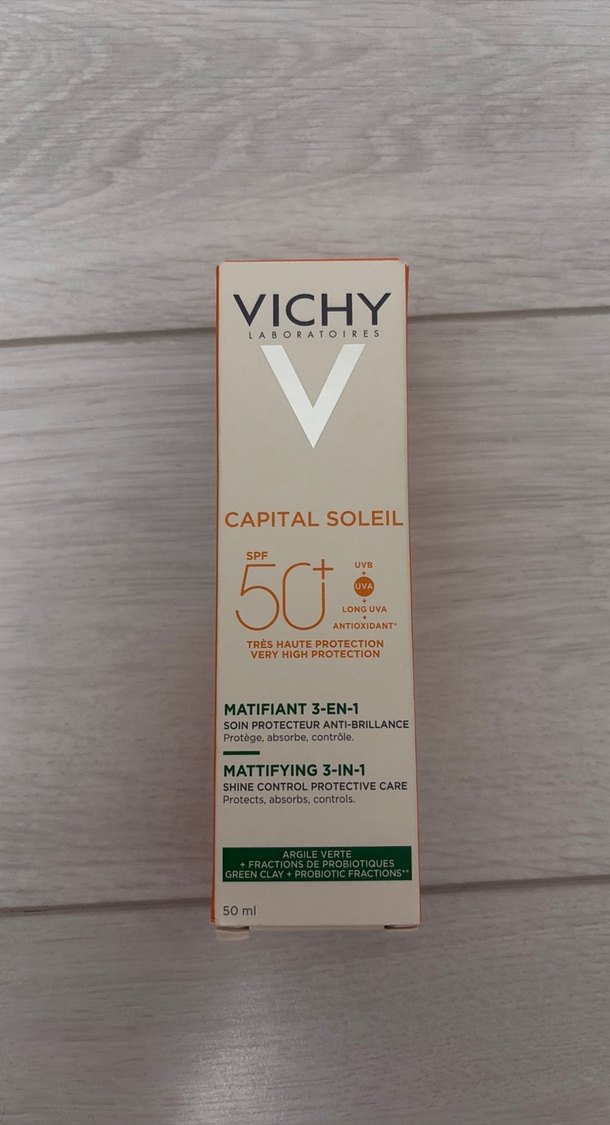 Vichy Capital Soleil SPF 50+ çok yüksek koruma sağlar. Matlaştırıcı 3'ü 1 arada bakım ile korur, emilir ve parlaklığı kontrol eder. Yeşil kil ve probiyotik fraksiyonlar içerir. ☀️