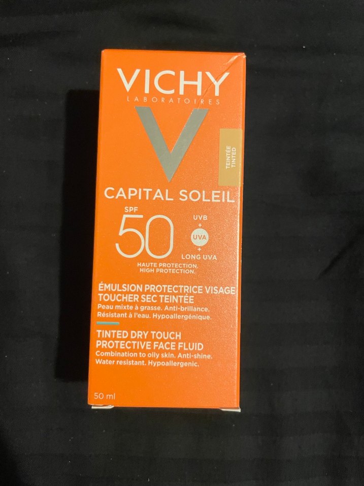 Vichy Capital Soleil SPF 50, karma ve yağlı ciltler için tonlu, kuru dokulu yüz koruyucu sıvıdır. Yüksek UVA ve UVB koruması, suya dayanıklı, parlama önleyici ve hipoalerjeniktir. 50 ml.