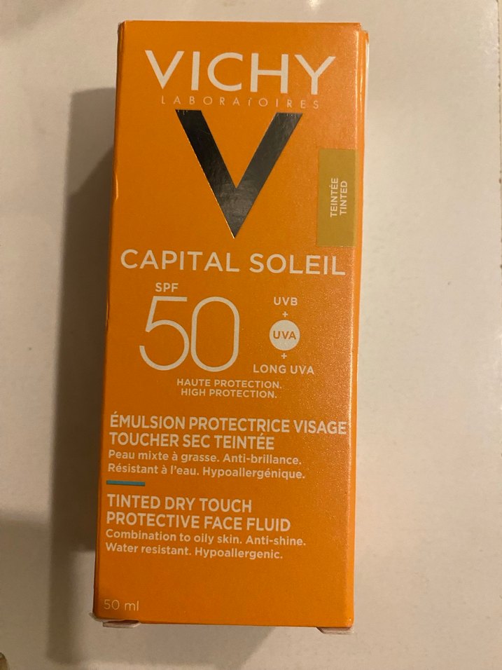 Vichy Capital Soleil SPF 50 tonlu, kuru dokulu yüz koruyucu sıvı. Karma ve yağlı ciltler için suya dayanıklı, anti-parlama ve hipoalerjenik formül.