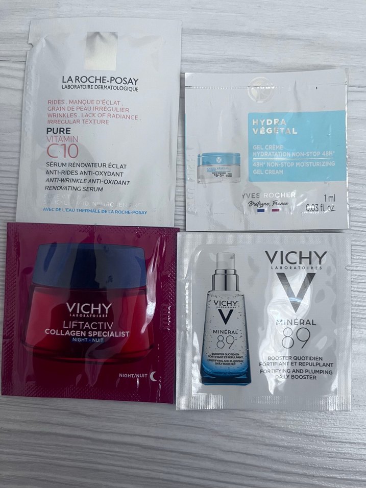 La roche posay pure vitamin C10 1,5 ml Vichy liftaktiv collagen gece 1,5 ml Vichy mineral 89 1,5 ml Yves rocher hydra vegetal 1 ml Orijinal ürünler. Deneme boyda.