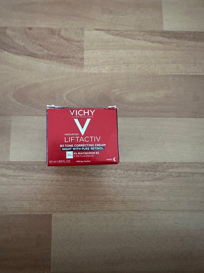 Kırmızı Vichy Liftactiv BB krem, saf retinol ve niasinamid B3 ile gece cilt tonunu düzeltir ve iyileştirir.