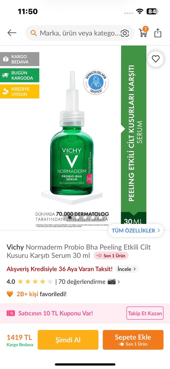 Ürünüm orjinal hic kullanilmamistir Vichy Normaderm Probio BHA Serum, 30 ml, cilt kusurlarına karşı peeling etkili, dermatologlar tarafından test edilmiştir.