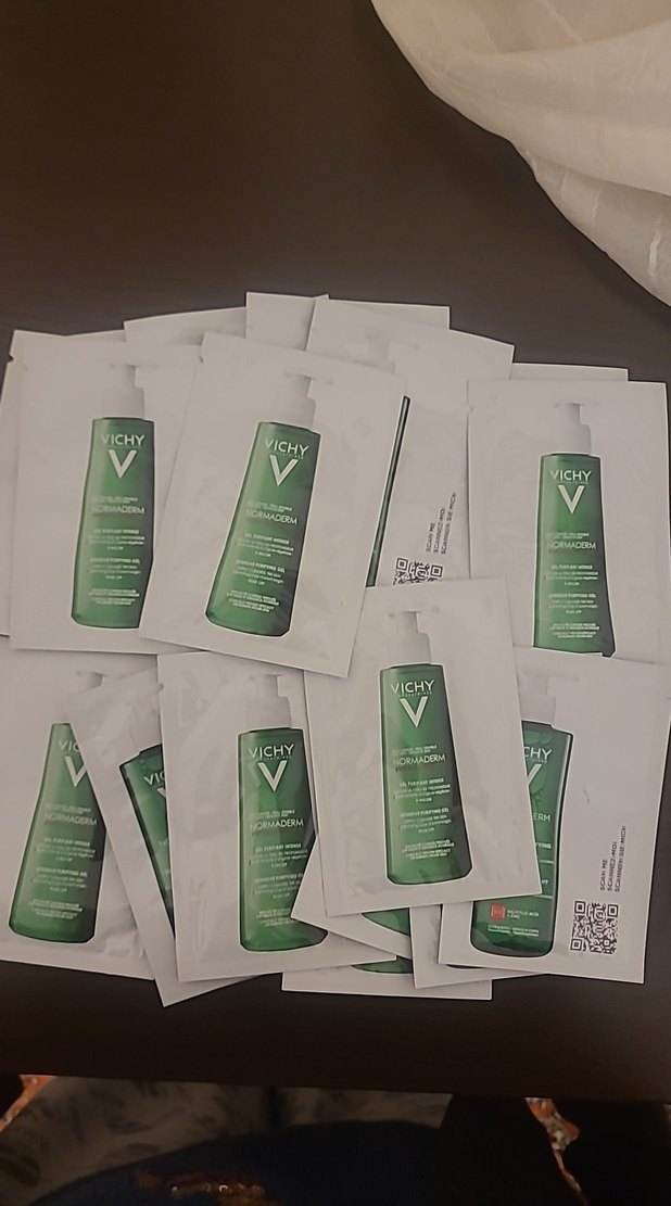 Derinlemesine temizlik ve cilt arındırıcı Vichy Normaderm temizleyici numune paketleri. Her pakette ürünün yeşil şişe görseli bulunur. 7ml.20 adet