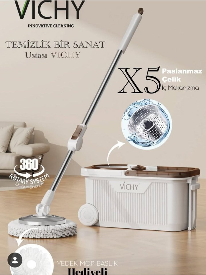 Vichy X5 mop seti, 360° döner sistem ve paslanmaz çelik iç mekanizmaya sahiptir. Yedek mop başlığı ile birlikte gelir.