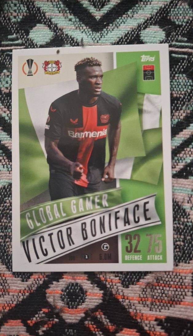 Siyah renkli Victor Boniface futbol kartı, canlı pop kültür tasarımı ve athleisure tarzı sunar. Savunma ve hücum istatistikleriyle global oyuncu kimliğini vurgular. ⚽