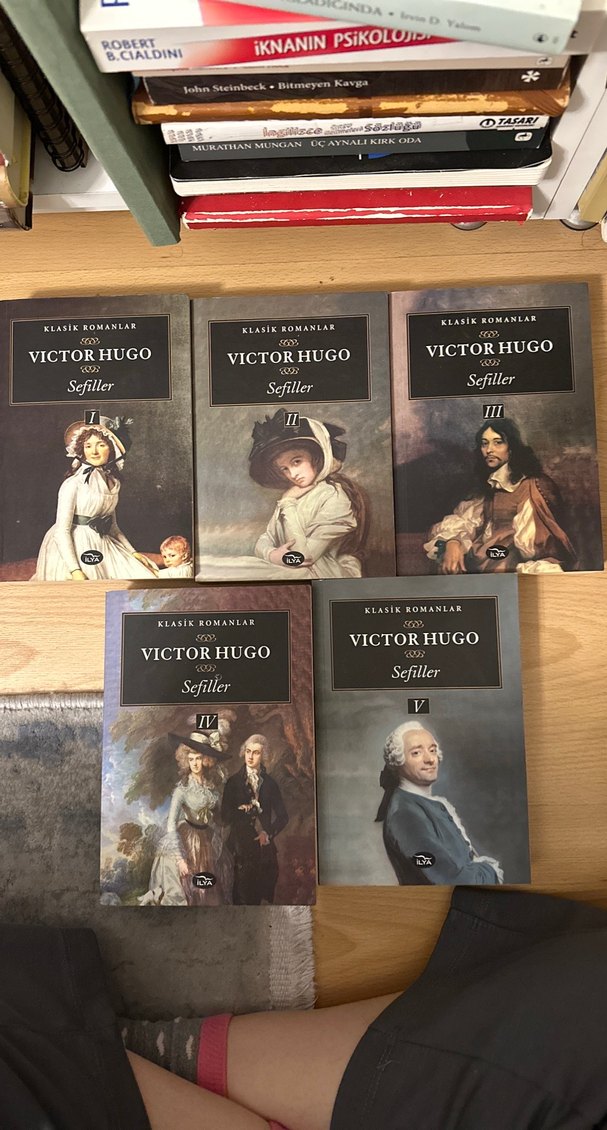 Victor Hugo'nun Klasik Romanlar serisinden Sefiller adlı eserin 5 ciltlik seti. Her kitap farklı portre kapaklar içeriyor.