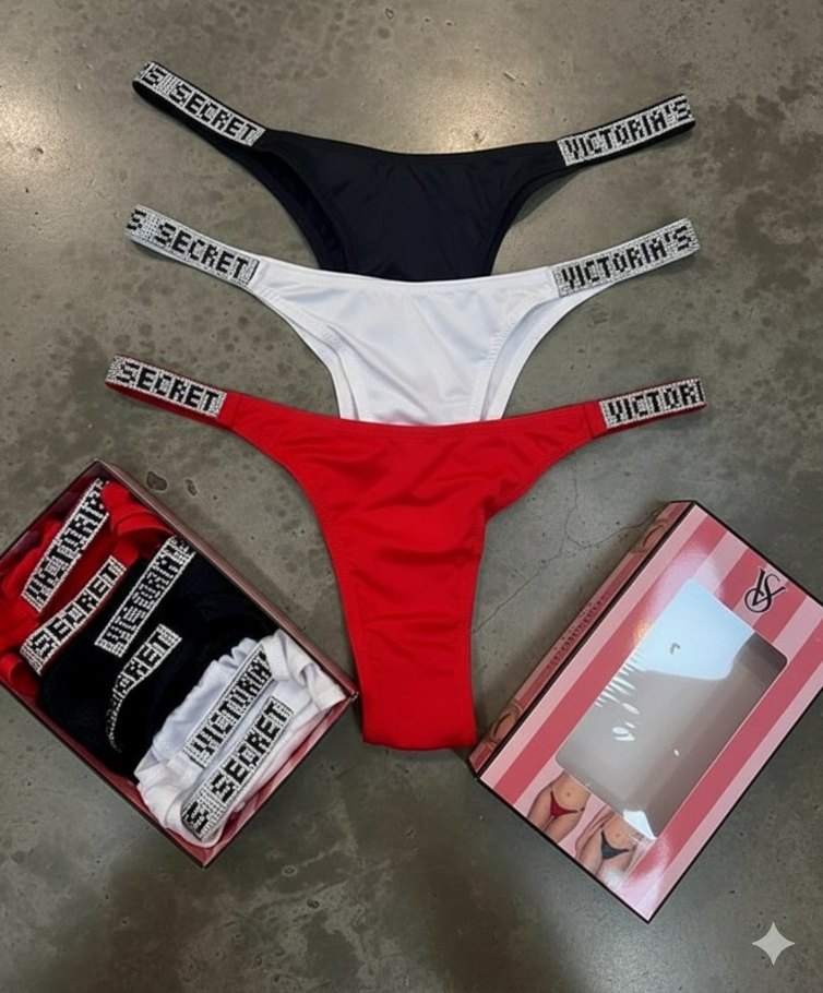 Victoria's Secret baskılı lastik bantlı, siyah, beyaz ve kırmızıdan oluşan 3'lü kadın spor külot seti. Streetwear tarzına uygun.
