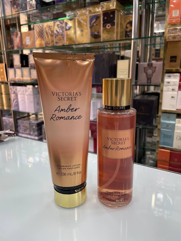 Victoria's Secret Amber Romance set, 236 ml vücut losyonu ve 250 ml vücut spreyi ile sıcak amber kokusu sunar.