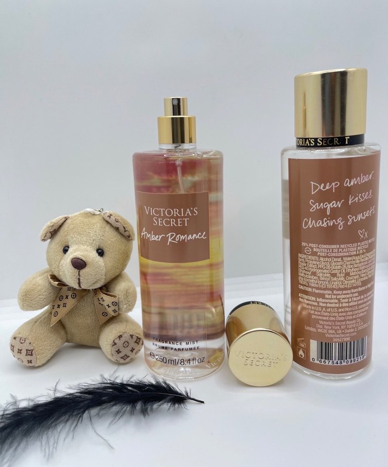 Victoria's Secret Amber Romance parfüm, 250 ml sprey şişede sıcak ve çekici bir koku sunar. Altın kapaklı, şeffaf şişede amber tonları bulunur.