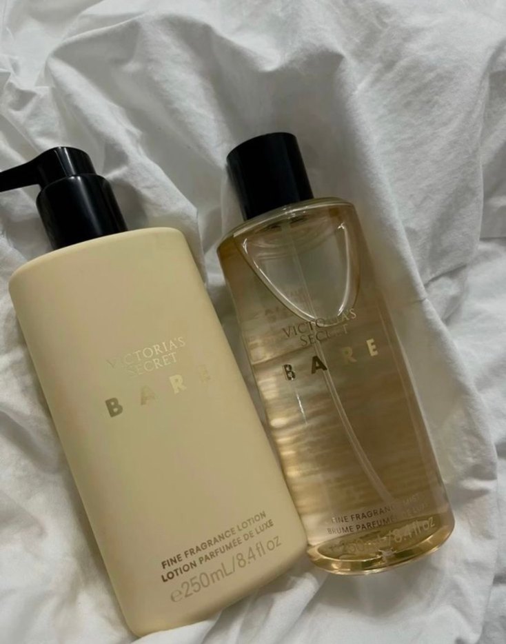 Victoria's Secret Bare kadın parfüm seti, 250ml'lik ince kokulu losyon ve vücut spreyi içerir, taze ve hafif bir koku sunar.