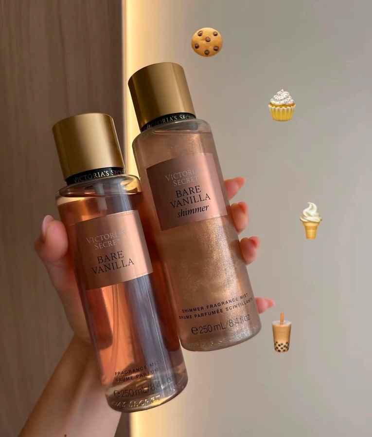 Victoria's Secret Bare Vanilla shimmer ve Bare Vanilla parfüm spreyleri, hafif parıltılı, sıcak vanilya kokusuyla 250 ml şişede sunulur.
