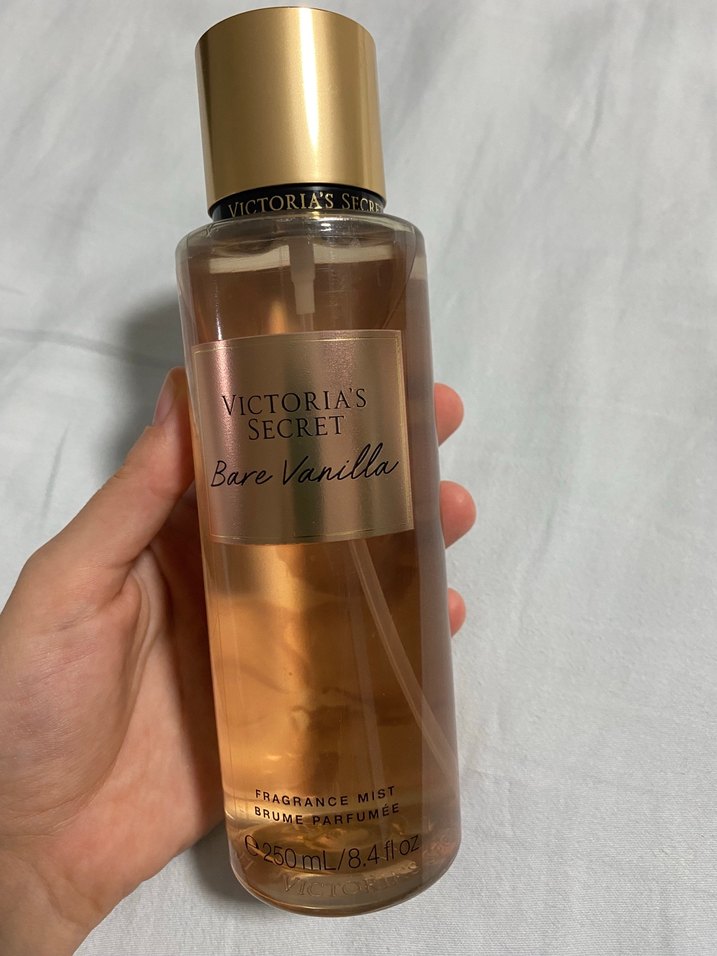 Victoria's Secret Bare Vanilla parfüm spreyi, 250 ml şişede hafif ve taze vanilya kokusu sunar. Orijinal sitesinden alınmıştır. Etiketi duruyor.