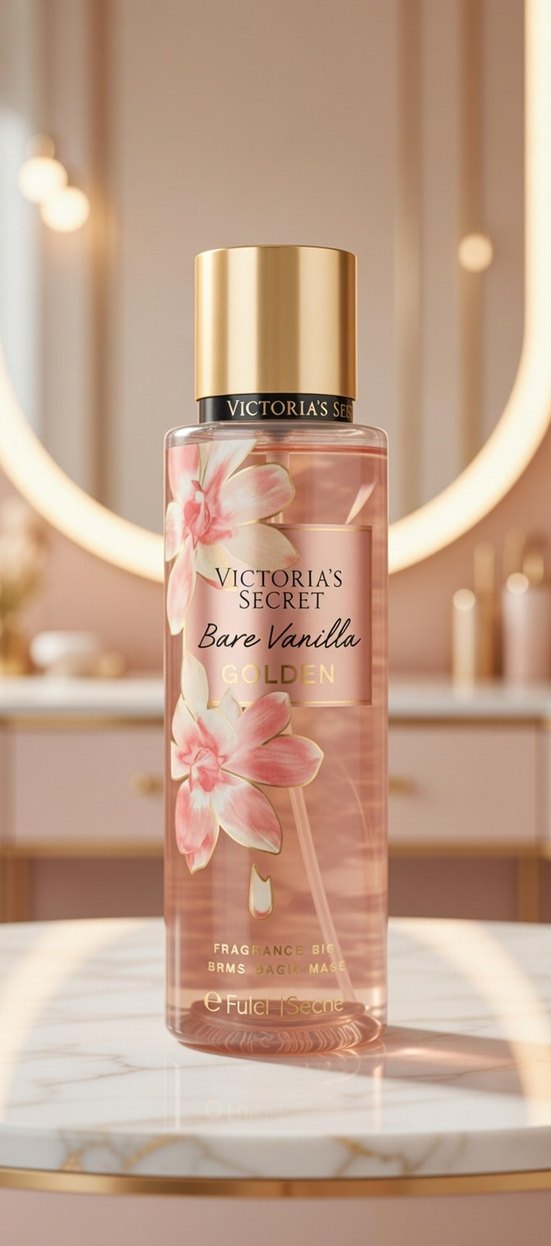 Victoria's Secret Bare Vanilla kadın parfümü, çiçek desenli şişesi ve altın kapak detaylarıyla tatlı ve sıcak vanilya kokusu sunar.