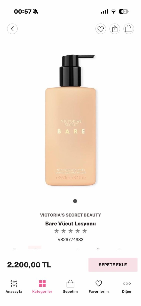Victoria's Secret Bare vücut losyonu, 250ml pompalı şişede hafif ve ferah bir koku ile cildi nemlendirir. %90 DOLUDUR