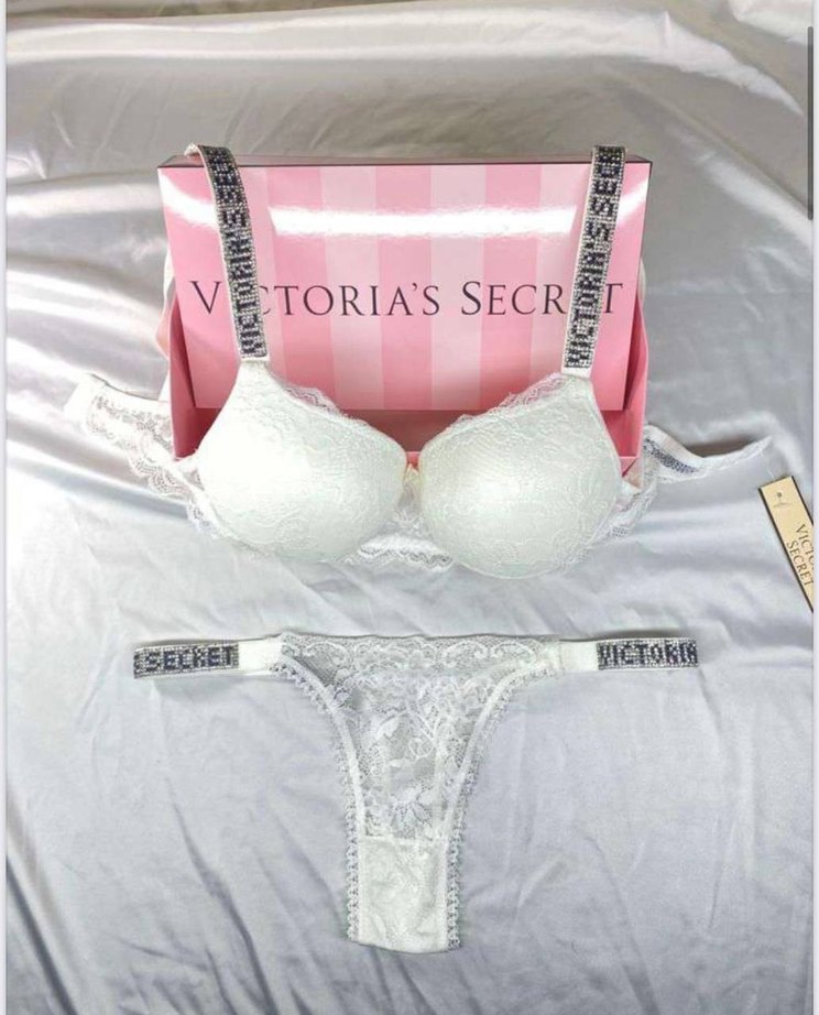 Victoria's Secret beyaz sütyen takımı, dantel detaylı ve marka yazılı baskılı askılarla bohem tarzda rahat bir tasarıma sahiptir.