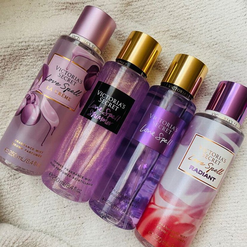 Victoria's Secret Love Spell ve Radiance gibi çeşitli kokulara sahip 250 ml vücut spreyi. Şık şişe tasarımlarıyla dikkat çeker.
