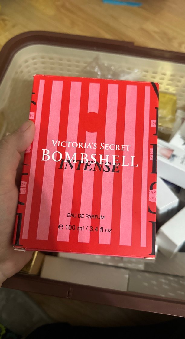 Victoria's Secret Bombshell Intense, 100 ml kadın parfümü, kırmızı çizgili kutuda sunulmaktadır.