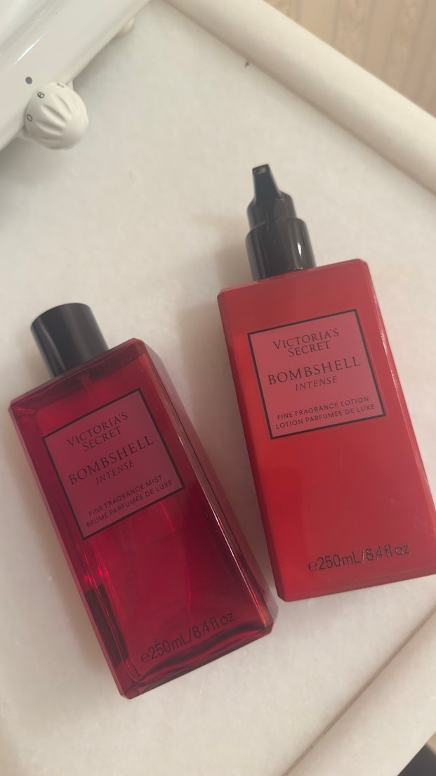 Victoria's Secret Bombshell Intense parfüm losyon 250ml şişede, kalıcı ve yoğun koku sunar. Kırmızı ambalajıyla dikkat çeker.