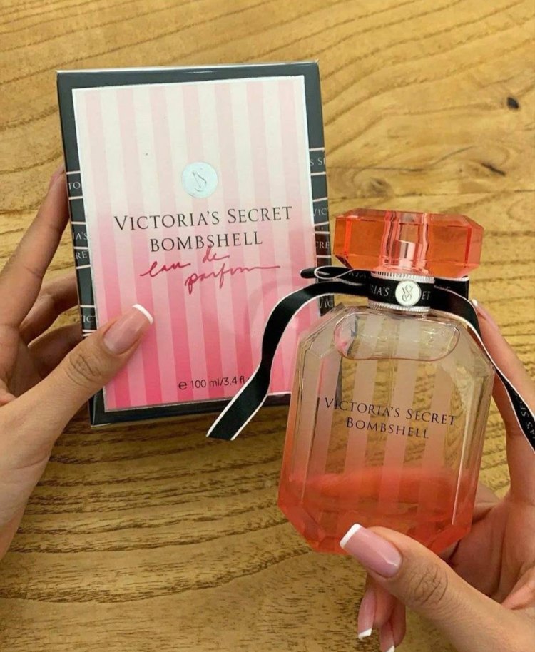 Victoria's Secret Bombshell kadın parfümü, 100 ml şişede, pembe tonlarda ve siyah kurdele detaylıdır.