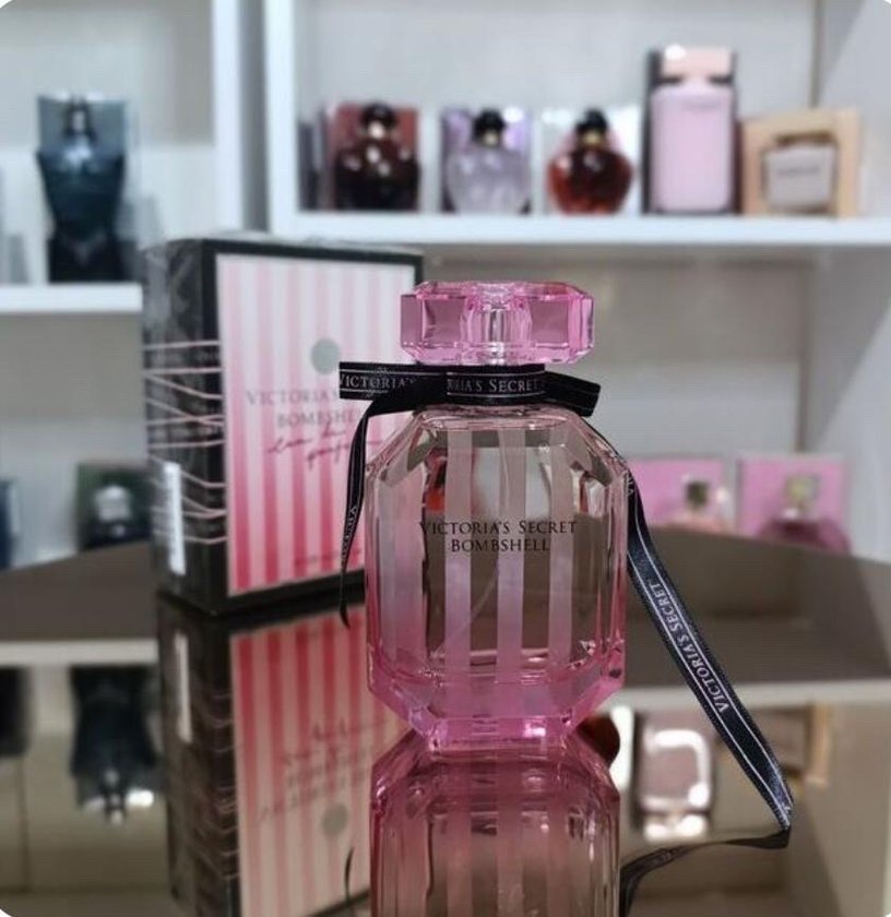 Victoria's Secret Bombshell kadın parfümü, kurdele detaylı pembe şişede, ferah ve çiçeksi koku sunar.