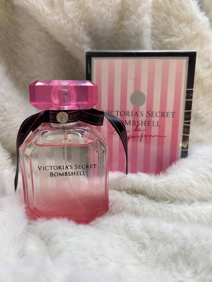 Victoria's Secret Bombshell kadın parfümü, pembe tonlu şişesi, keskin kapak ve siyah kurdele detayıyla birlikte gelir. Çizgili pembe-beyaz kutuda.