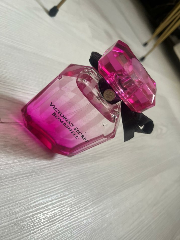 Victoria's Secret Bombshell kadın parfümü, siyah kurdeleli pembe keskin şişede, ferah ve çiçeksi kokulu.