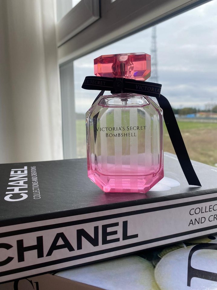 Victoria's Secret Bombshell kadın parfümü, siyah kurdela detaylı pembe şişede. Çiçeksi ve ferah kokusu ile öne çıkar.
