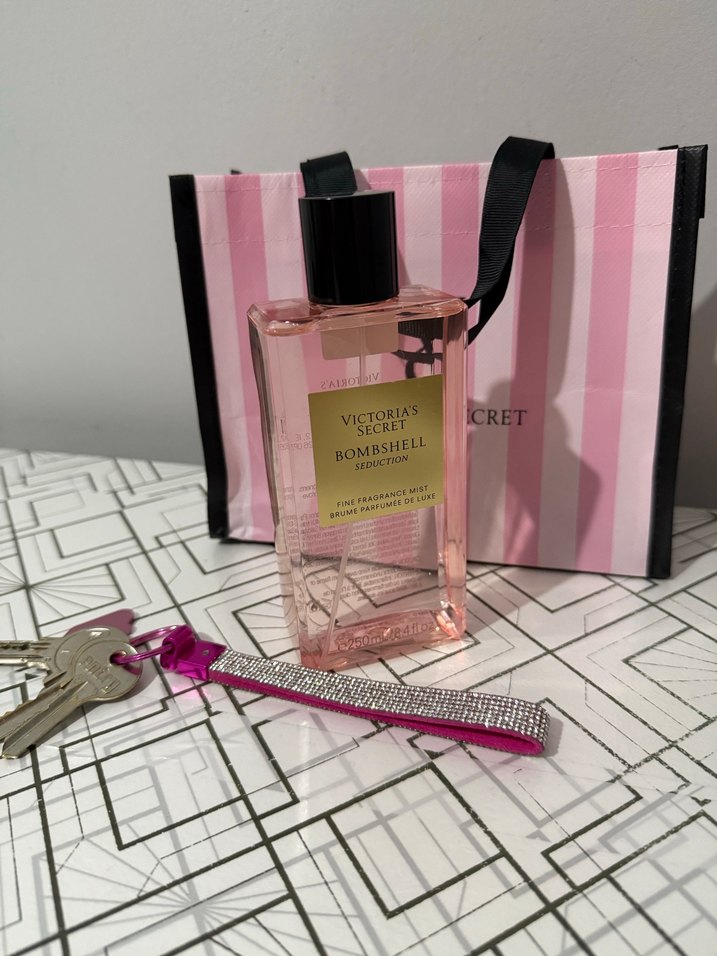 Victoria's Secret Bombshell kadın parfümü, şık şişede ince bir koku spreyi ve markanın imzası pembe çizgili çanta ile birlikte gelir.