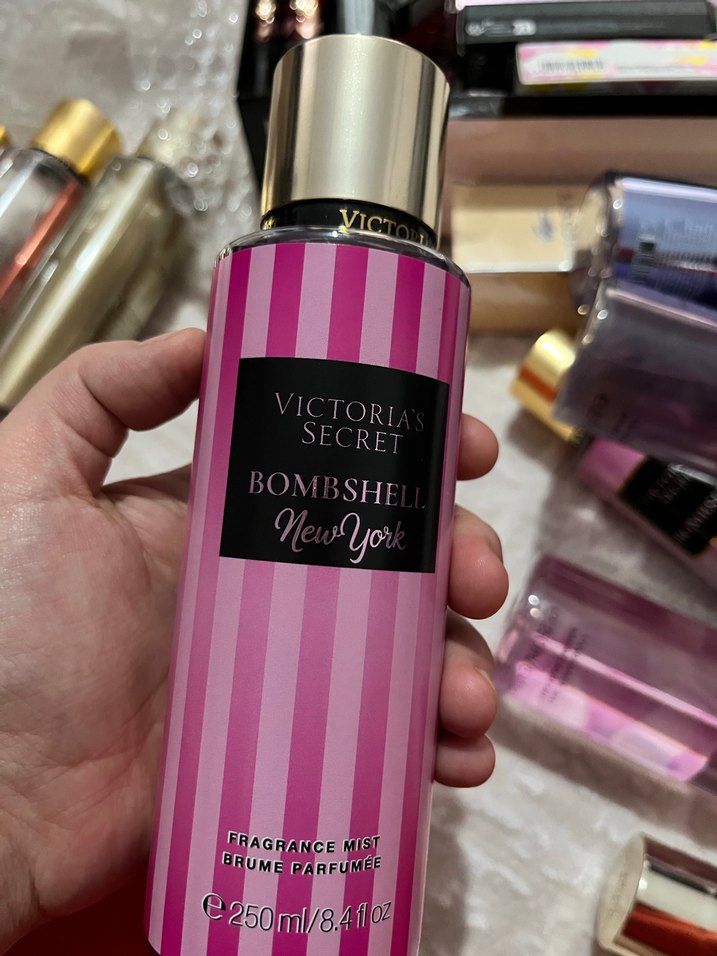 Victoria's Secret Bombshell New York, 250 ml parfüm spreyi, pembe çizgili şişede, altın kapaklı, taze ve zarif koku sunar.