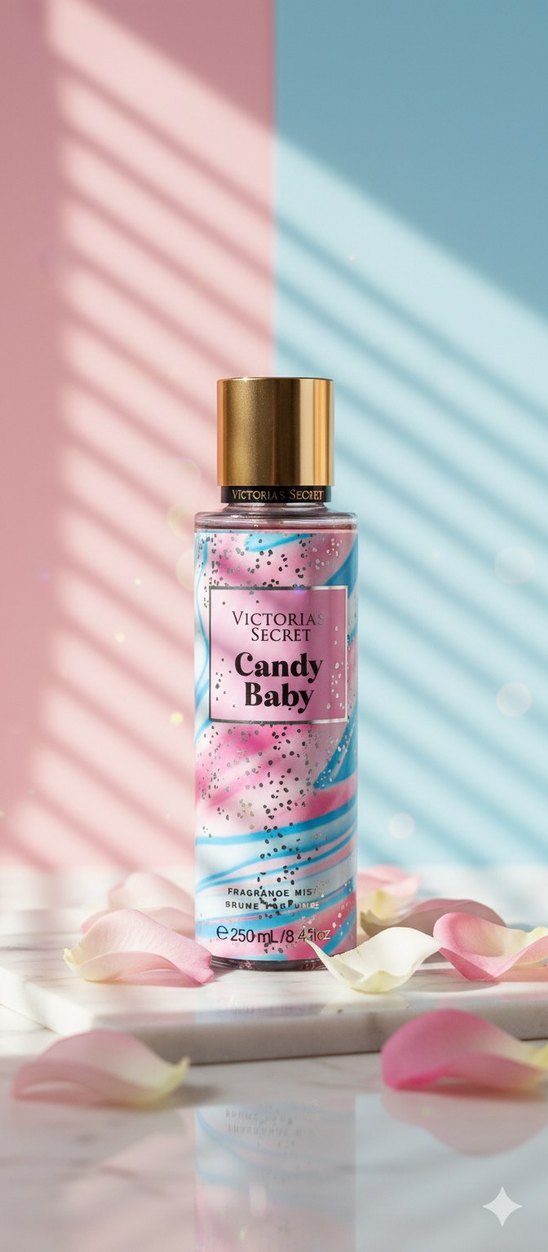 Victoria's Secret Candy Baby 250 ml parfüm spreyi, tatlı ve ferah bir kokuya sahiptir. Şişe renkli tasarıma ve altın kapak detayına sahiptir.