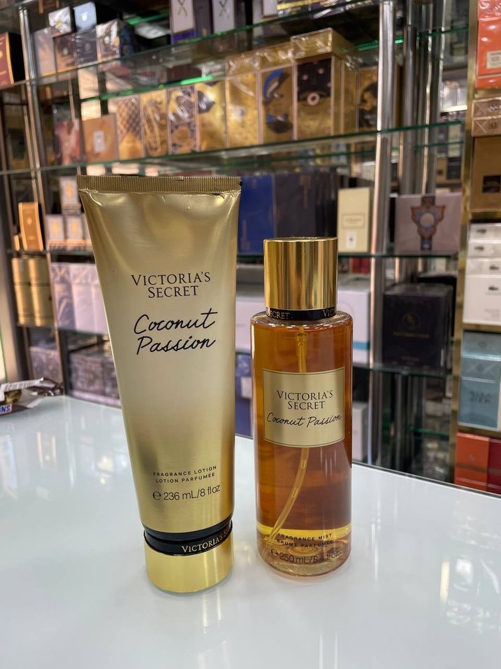 Victoria's Secret Coconut Passion seti, hindistancevizi kokulu parfüm ve 236 ml vücut losyonundan oluşur. Şık ambalajıyla dikkat çeker.