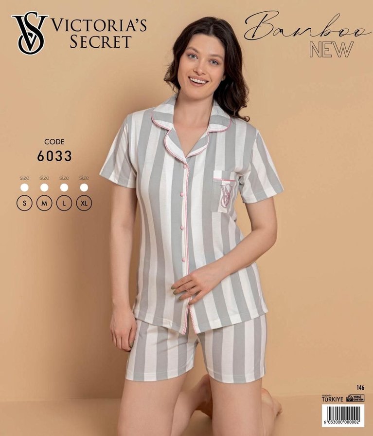 Victoria's Secret markalı, gri zebra desenli, kısa kollu ve kısa paçalı rahat kesim pijama takımı. Üstü düğmeli ve cep detaylıdır.