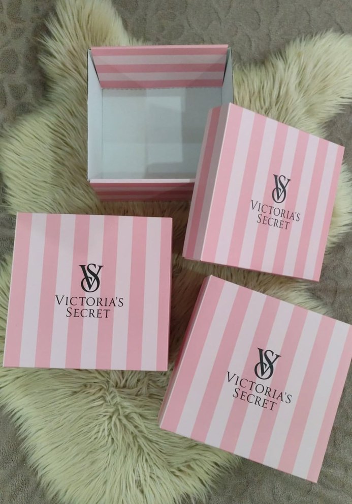 Victoria's Secret kadın parfüm kutuları, pembe çizgili tasarımı ve marka logosu ile şık bir saklama seçeneği sunar.