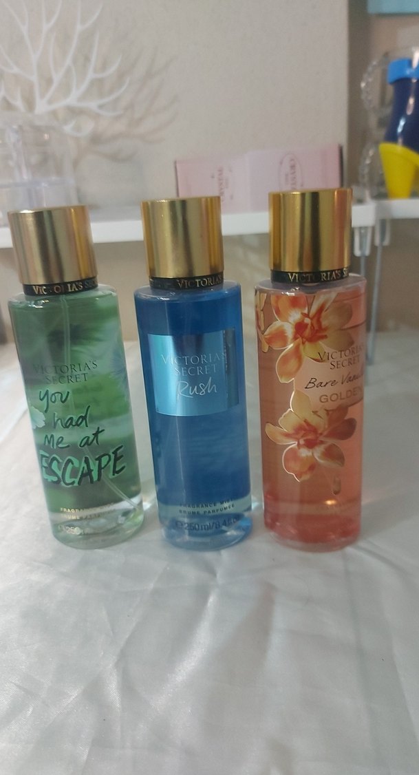 Victoria's Secret kadın parfüm seti, You Had Me at Escape, Rush ve Bare Vanilla Gold olmak üzere üç farklı taze ve çiçeksi koku içerir. Her şişe altın kapaklıdır.