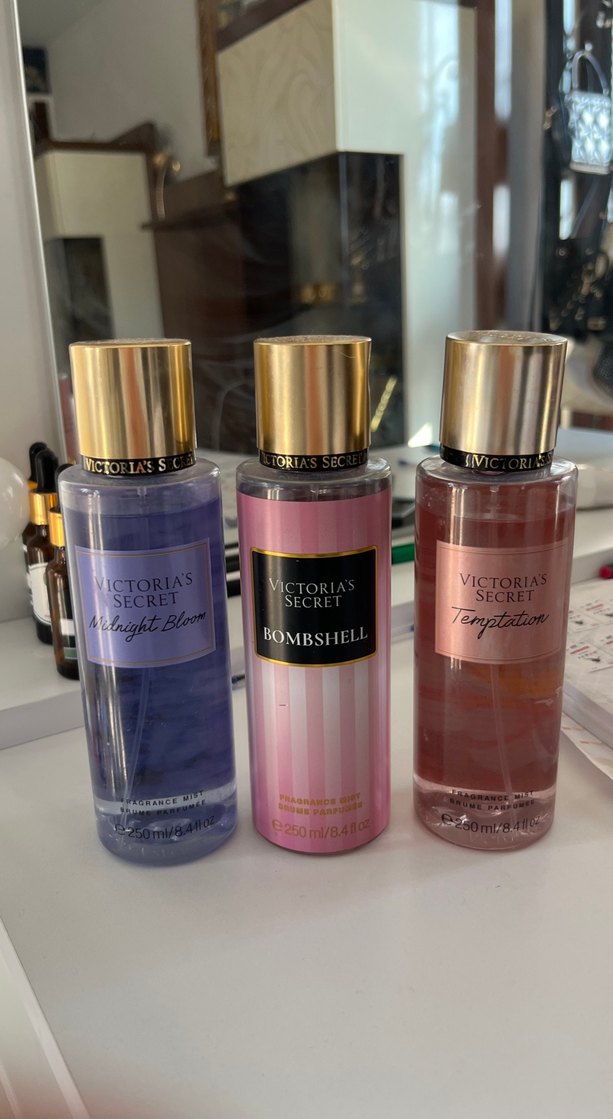 Victoria's Secret markasına ait Midnight Bloom, Bombshell ve Temptation kadın parfümü 250 ml şişelerde, altın kapaklı set halinde.