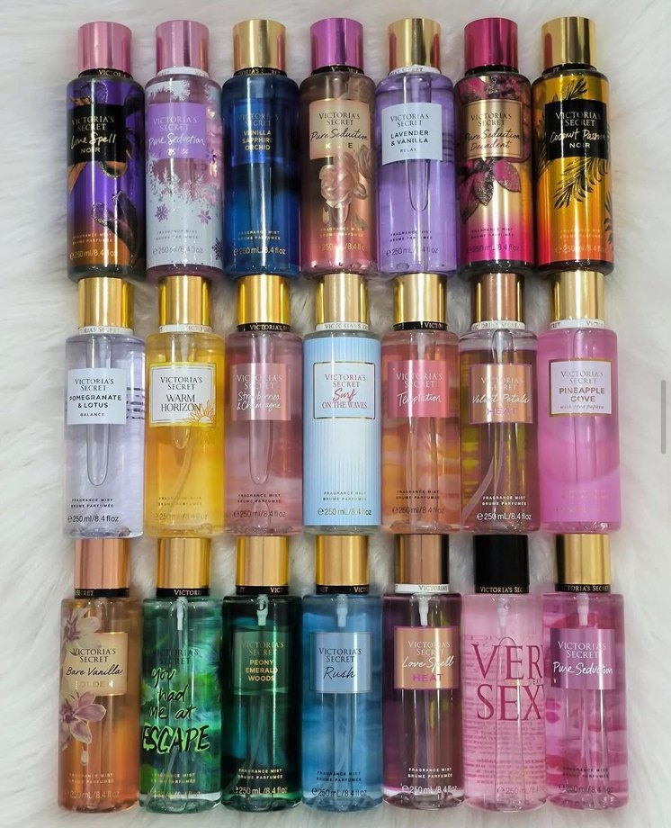 Victoria's Secret markalı, çeşitli çiçeksi, meyvemsi ve tatlı kokulara sahip kadın parfüm seti. Şık sprey şişelerde sunulur.