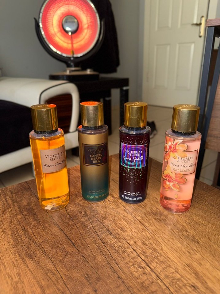 Victoria's Secret markalı, farklı kokularda dört kadın parfümü içeren set. Altın kapaklı ve renkli sıvılı şişelerden oluşur.