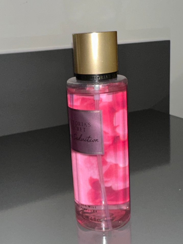 Victoria's Secret kadın parfümü, pembe sıvı ve altın kapaklı. Canlı ve feminen bir kokuya sahip. (Sadece kokusuna bakılması için 1/2 fıs sıkılmıştır)