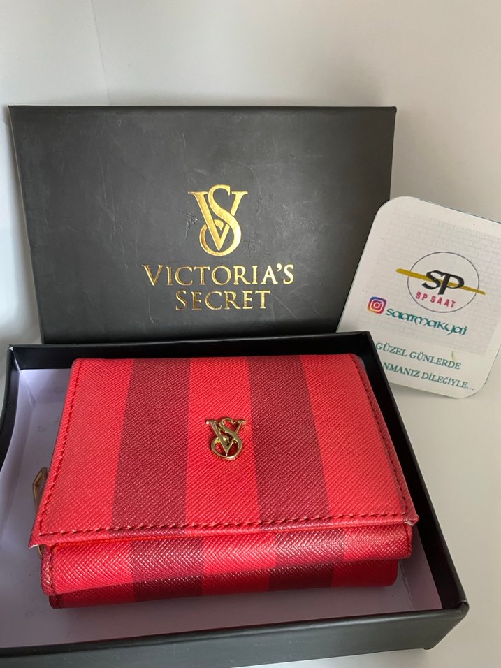 Victoria's Secret kırmızı deri, parlak ve baskılı desenli, fermuarlı cüzdan. Klasik zarafet ve streetwear stilini birleştirir.