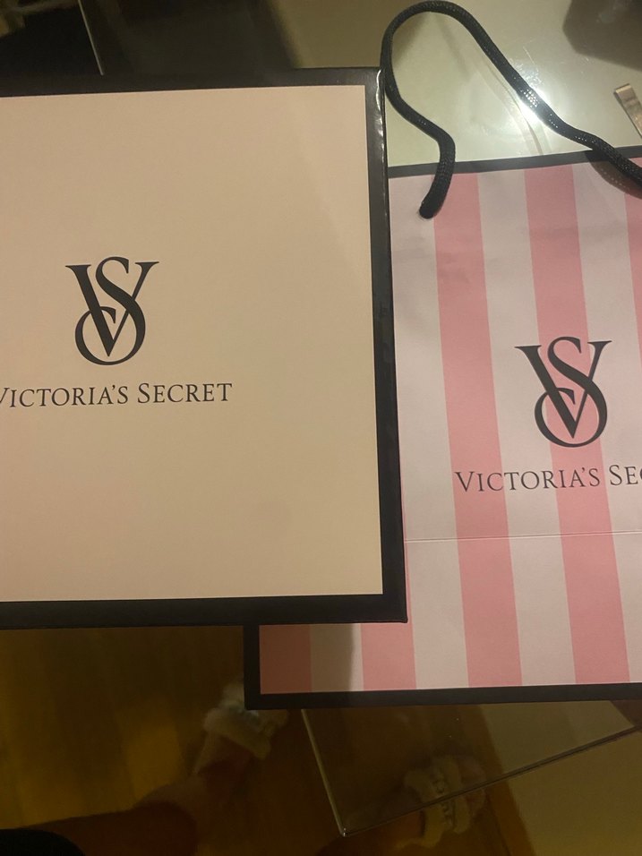 Victoria's Secret, ikonik VS logosu ve pembe çizgili alışveriş çantasıyla şık bir kutuda sunuluyor.