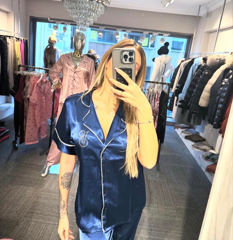 Victoria's Secret BASKILI PİJAMA TAKIMI. Sıfır etiketlidir. S, M, L, XL, 2XL ve 3XL bedenleri mevcuttur. A++ kalitedir. İpek saten kumaştır.