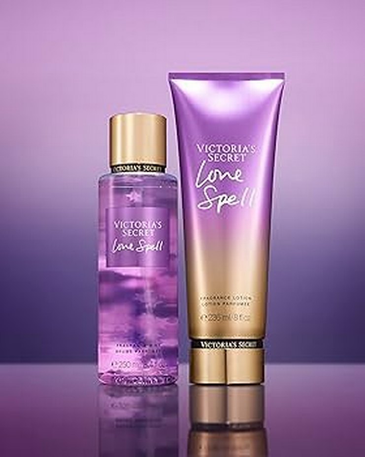 Victoria's Secret Love Spell seti, vücut spreyi ve losyon içerir. Mor ve altın renkli ambalajda, ferah ve çiçeksi bir koku sunar.