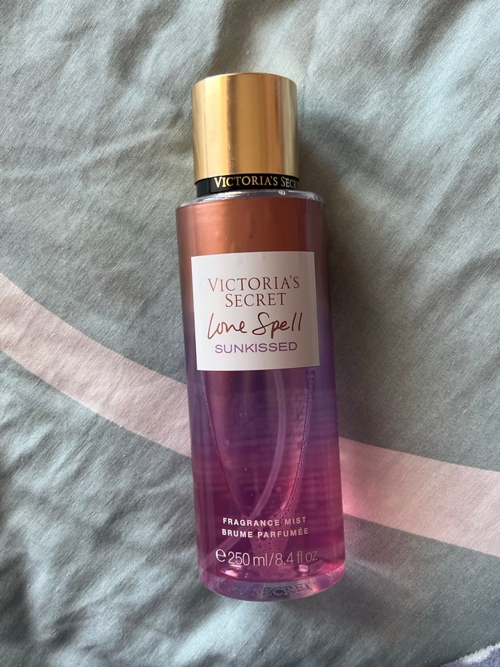 Victoria's Secret Love Spell Sunkissed, 250ml kadın parfüm spreyi, yumuşak ve ferahlatıcı kokulu. Şişe pembe-turuncu degrade renkli, altın kapaklı. Orijinal ürün çok az kullanıldı görseldeki gibi kapak kısmı işaretlenen yer takıp çıkartılınca hareket ediyor onun dışımda bir sıkıntısı yok kokusu kalıcı