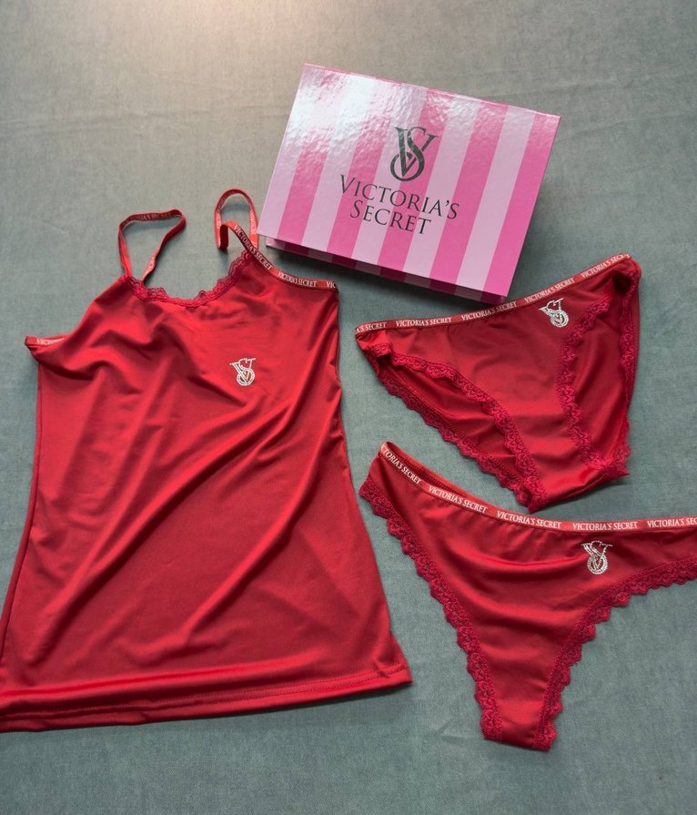 Victoria's Secret parlak kırmızı mini atlet ve dantel detaylı iki adet külot seti, baskılı marka logosu ile sokak stili için uygun.