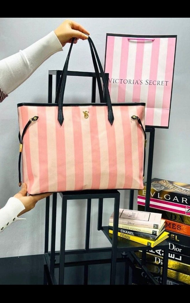 Victoria's Secret pembe çizgili kadın çanta, fermuarlı kapanış ve siyah saplara sahip. Sentetik kumaştan, cesur Paris tarzı streetwear için uygun.