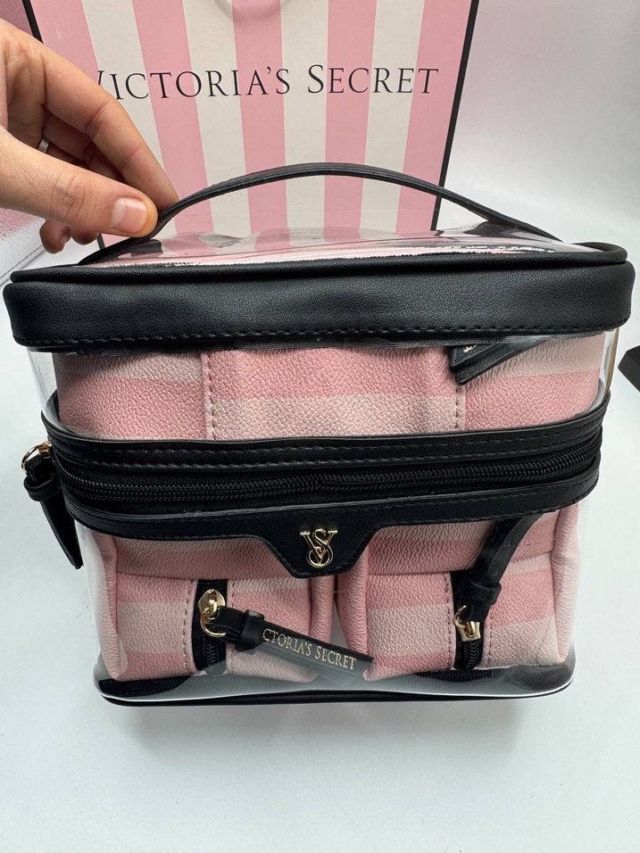 Pembe çizgili, fermuarlı ve sentetik kumaştan yapılmış Victoria's Secret makyaj çantası. Şeffaf dış yüzey, siyah detaylar ve elde taşımak için kulpu vardır.