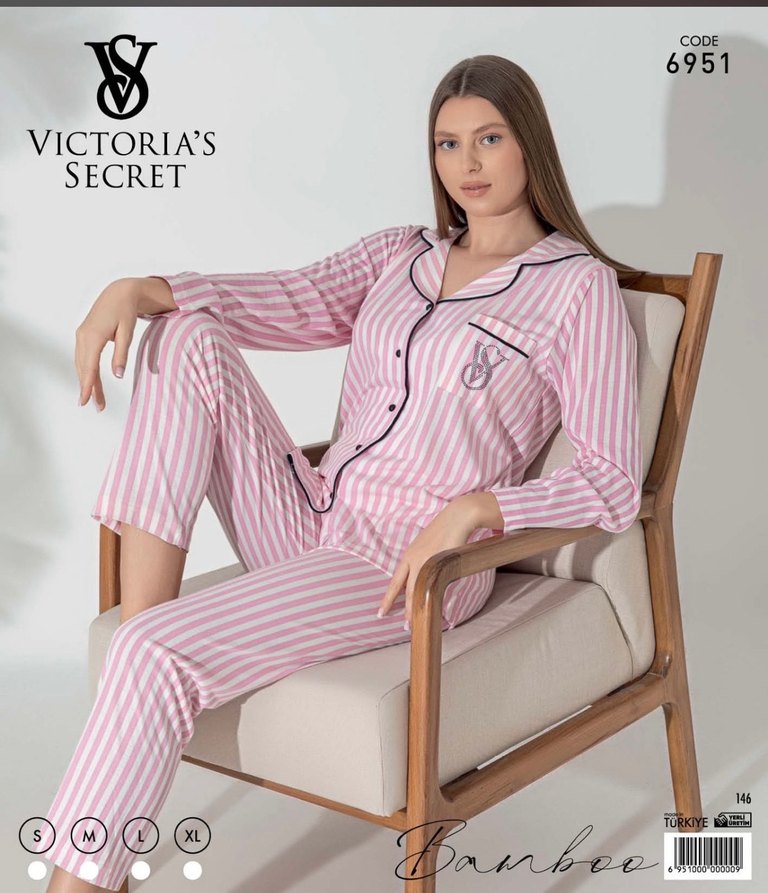 Victoria's Secret pembe ve beyaz çizgili, uzun kollu, midi boy pijama takımı. Siyah biyeli, rahat ve yumuşak kumaştan üretilmiştir.