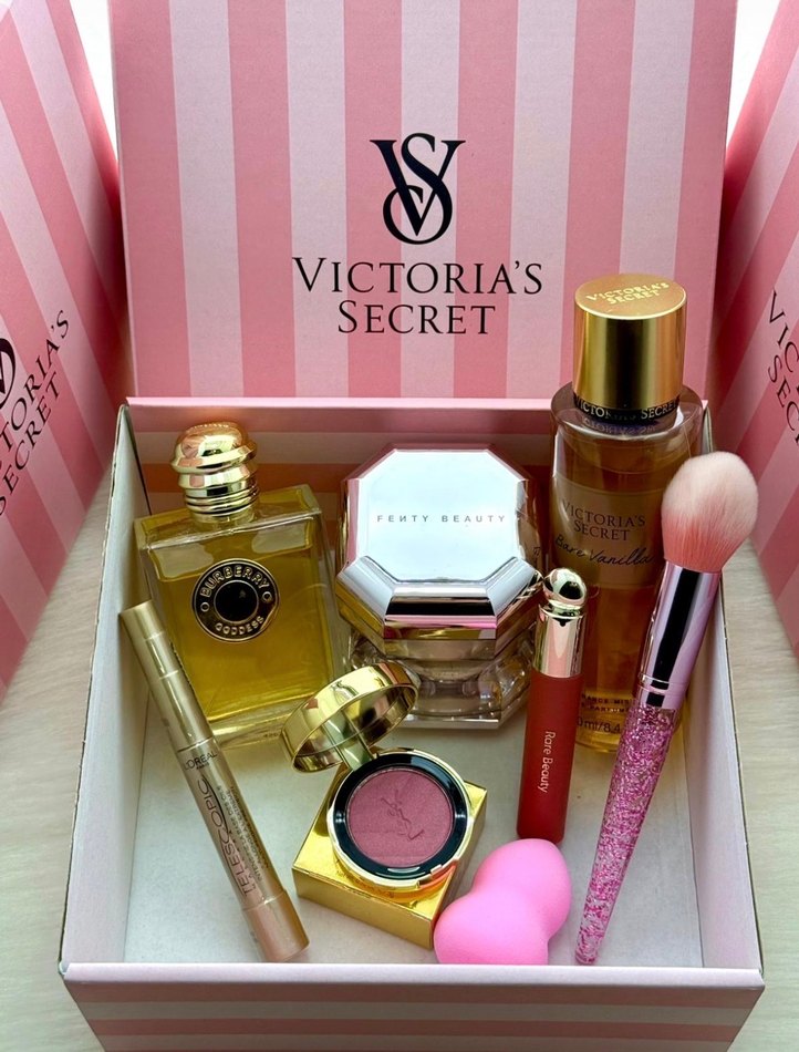 Victoria's Secret marka, açık pembe tonlarda makyaj fırçası, ruj, allık ve parfüm içeren makyaj seti.